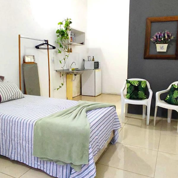 Equipada com frigobar, microondas, cafeteira e sanduicheira Cama Casal